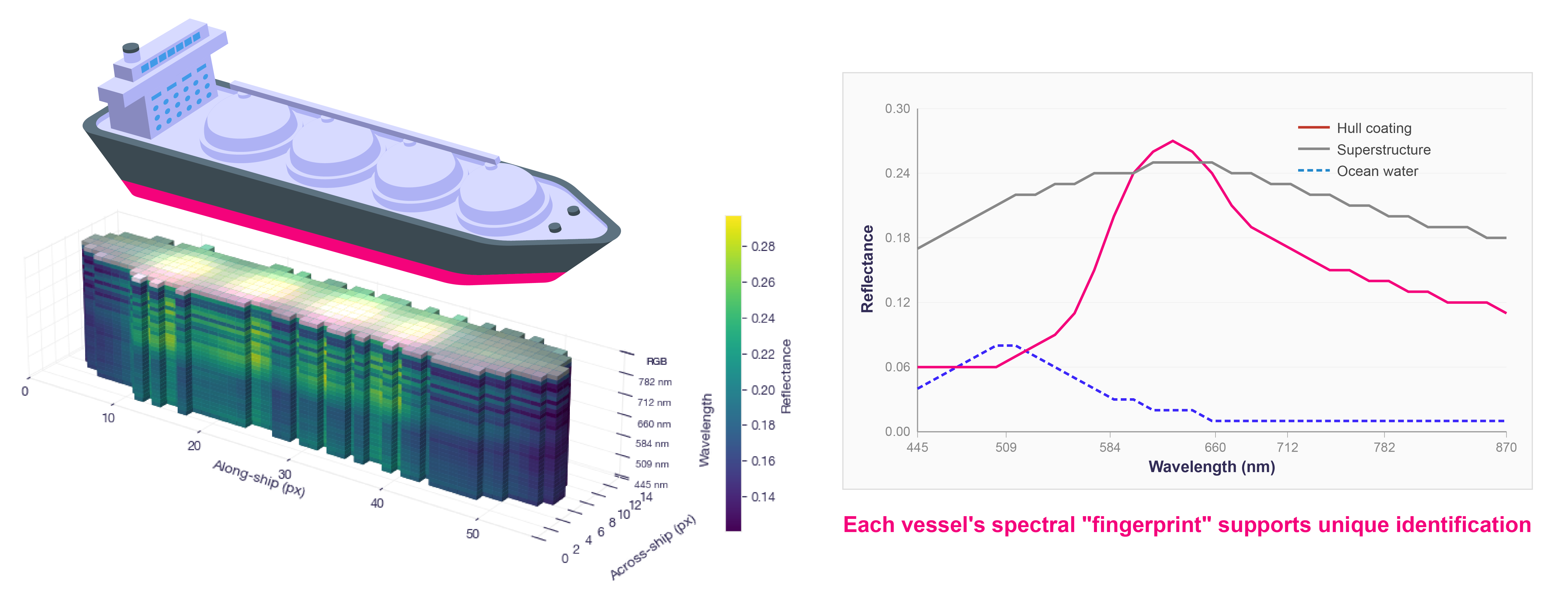 High-resolution optical imagery excels at visual identification, but it captures light in only a few broad spectral bands. That tells an analyst what a vessel looks like: its shape, size, and colour. What it doesn’t reveal is what the vessel is made of, what coatings are on the hull, or what materials are on deck. Two ships painted the same colour will look identical in a conventional photograph, even if their surface compositions are entirely different.